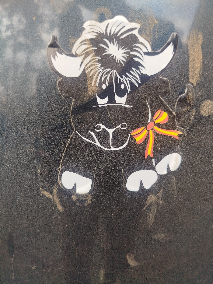 A dusty, close-up shot features a cartoon yak or bull sticker