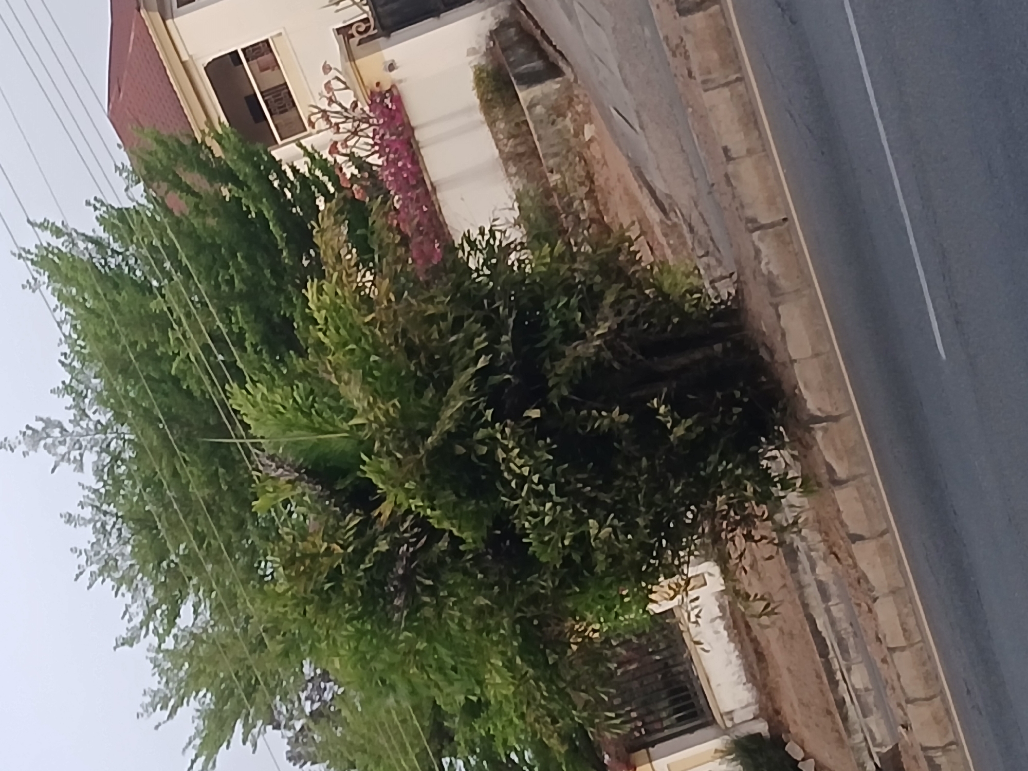 The image depicts an outdoor urban scene in Jos, Nigeria, characterized by a street, vegetation, and a residential building. In the foreground, a grey asphalt road with a central white solid lane marking and a faded white edge line is visible, bordered by a concrete curb. Beyond the curb lies a narrow dirt and sparse vegetation strip. A large, dense tree with numerous green leaves dominates the left and central midground, its foliage obscuring its lower trunk. To the right and behind the tree, a multi-story building with a light-colored facade and a reddish-brown tiled roof is visible, featuring a balcony with a dark metal railing. A white perimeter wall, partially topped with pink/purple flowering plants, separates the property from the street. A dark metal gate is partially observable on the far right. Multiple thin, dark utility lines span across the upper portion of the frame against a pale, overcast sky. No individuals or active subjects are present.