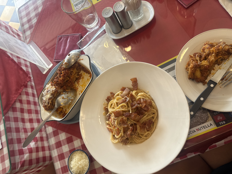 This image depicts a dining table scene in a restaurant in Thong Sala, Thailand. The table is covered with a red and white checkered tablecloth, overlaid with a clear glass top and a red table mat on the right. Prominently displayed are three food items: 1. A white, deep-rimmed bowl contains a serving of spaghetti carbonara, generously topped with diced bacon. 2. A rectangular white baking dish holds a partially consumed portion of lasagna with a rich tomato-based sauce and melted cheese. Two metal serving spoons rest within this dish. 3. A smaller white plate presents a slice of the lasagna, also partially eaten, accompanied by a fork and a serrated knife. To the left of the spaghetti, a small white bowl contains grated cheese. On the right, an empty clear drinking glass with a yellow "NO SMOKING" label is visible. Next to it, a white ceramic tray holds two silver-colored salt and pepper shakers and a clear glass container with numerous toothpicks. A clear acrylic menu stand is positioned behind the lasagna dish. A rectangular red coaster is visible beneath the glass. A transparent plastic wrapper or bag lies near the salt and pepper shakers, and a white napkin is placed under the lasagna dish. A partially visible package labeled "NUTELLA" is on the lower left, beneath the tablecloth. No individuals are visible in the frame, though the arrangement suggests an ongoing or recently concluded meal.