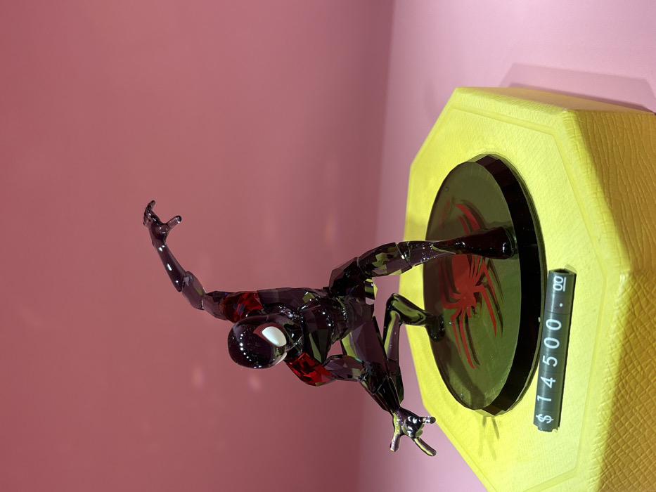A faceted crystal figurine depicting Miles Morales, also known as Spider-Man, is displayed in a crouching, dynamic pose with arms extended, against a solid pink background