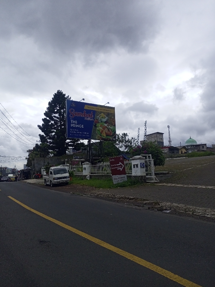 A cloudy day illuminates a roadside scene featuring "Sambal THE PRINCE" restaurant. A large billboard advertising the eatery stands prominently. The road, marked with a yellow line, runs along the foreground. A white van is parked nearby. In the background, a building with antennas and a mosque dome are visible. Entry signage and restaurant markers are also present.