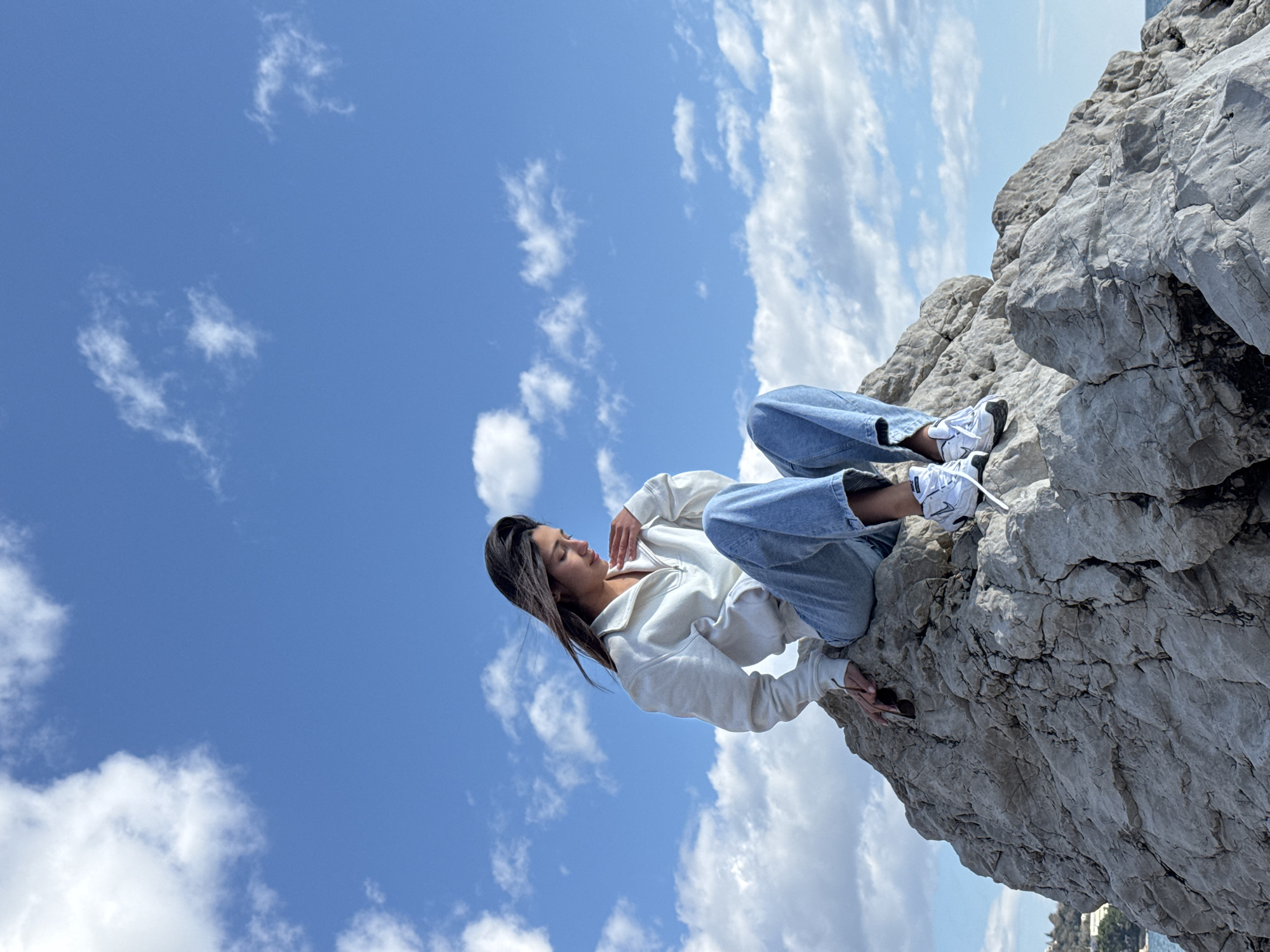 A female individual is seated on a large, irregular grey rock formation under a clear blue sky with scattered white cumulus clouds in Sutomore, Montenegro. She is wearing a white quarter-zip long-sleeve sweatshirt, light blue loose-fitting jeans, and white sneakers with black accents, one displaying a visible Nike logo. Her long, dark hair is slightly disheveled, suggesting a breeze. Her head is tilted downwards, and her gaze is directed towards her left. Her left hand rests near her collarbone, while her right hand holds a pair of dark-framed sunglasses against the rock surface. In the distant lower-left background, light-colored buildings are visible on land, and a segment of blue water is present in the lower-right background.