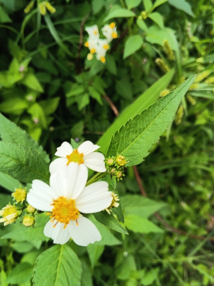 The image displays a close-up view of vegetation in Koipa, Papua New Guinea. In the foreground, two white daisy-like flowers with prominent yellow-orange centers are visible, surrounded by several green flower buds and vibrant green leaves. A distinct large, serrated green leaf extends from the upper right towards the center. The background features blurred green foliage, including additional out-of-focus white flowers with yellow centers and some fuzzy, light green spike-like plant structures. No people, animals, or artificial objects are present. The scene depicts natural flora in an outdoor setting.