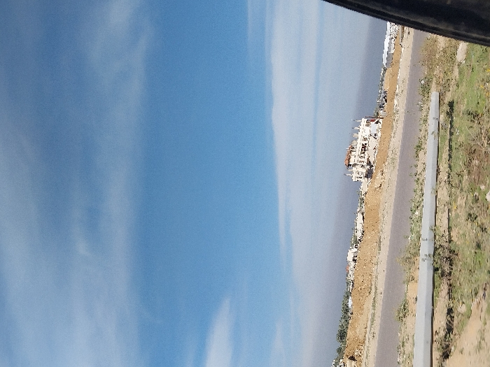 The image depicts an outdoor scene in al-Qarara, Palestinian Territory, under a clear blue sky with sparse white clouds. A paved road and a metallic guardrail occupy the lower third of the frame. Above the road, a significant expanse of disturbed, light-brown earth, consistent with a construction site or recent excavation, stretches horizontally. Positioned prominently on this elevated earth in the mid-right is a multi-story building exhibiting extensive structural damage or being in an advanced state of deconstruction/construction, with visible concrete framework and remnants of a tiled roof. Various pieces of debris and smaller, partially obscured structures are scattered across the terrain. Distant terrain and a hazy horizon are visible in the background. No individuals or active processes are discernible.