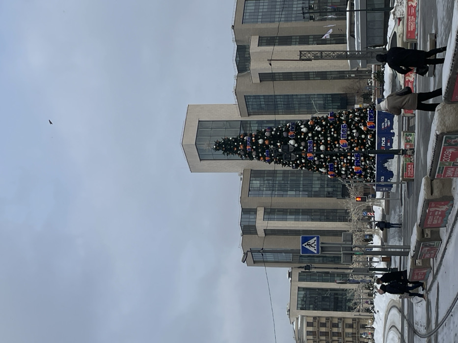 A tall, decorated Christmas tree stands in front of modern buildings on a winter day. Pedestrians walk across a crosswalk near the tree. Street signs and snowy sidewalks indicate an urban setting. A bird flies in the cloudy sky. The buildings feature a mix of glass and stone architecture. Advertisements are placed near the street.