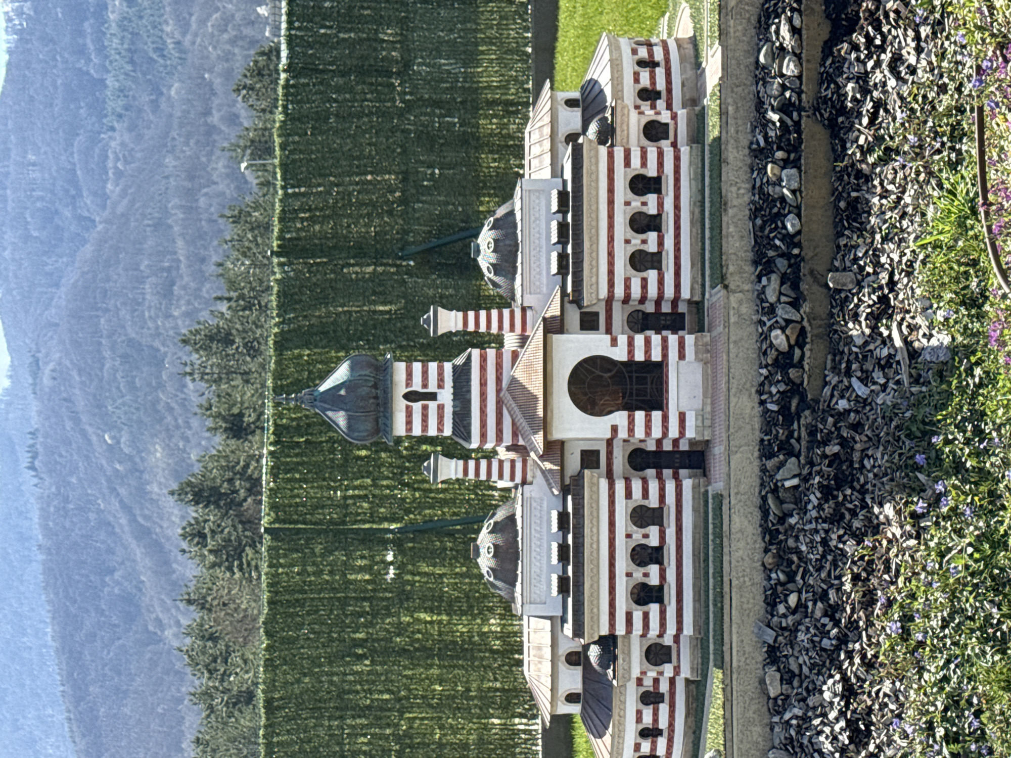 miniature model of the Alexander Nevsky Cathedral, located in the city of Pravets, Bulgaria. The model features red and white striped pillars and a dome. The background consists of a green grassy area and trees on a hill. The model is placed on a light brown surface with grey pebbles and some vegetation including some purple flowers.
