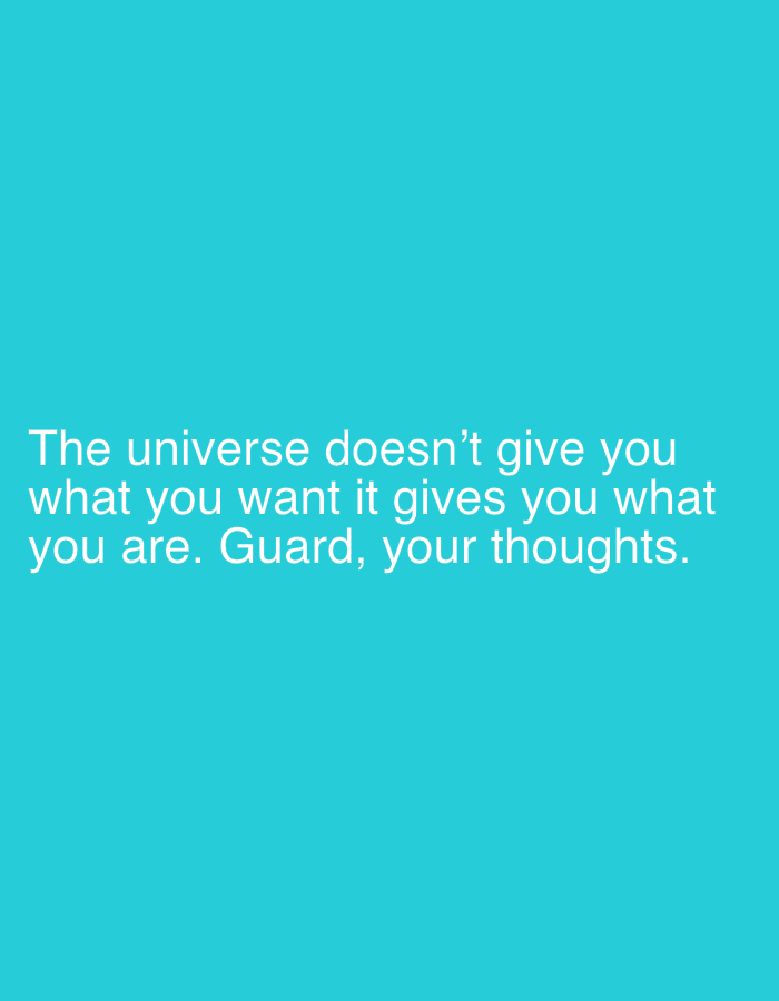 The image features a solid, uniform teal-colored background. White sans-serif text is horizontally centered in the lower portion of the frame. The text reads: "The universe doesn't give you what you want it gives you what you are. Guard, your thoughts." No people, physical subjects, objects, actions, or interactions are depicted. The image provides no visual information to determine a specific physical location in Ado, Nigeria, or any other geographical area.