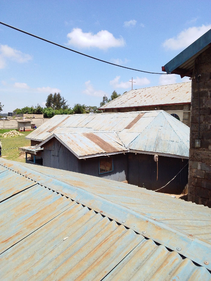 This image presents an elevated, oblique view of multiple structures under a clear blue sky with scattered white cumulus clouds, situated in Ndeiya, Kenya. In the immediate foreground, the rust-stained, light blue corrugated iron roof of an unseen building occupies the lower portion of the frame. Directly behind this, a single-story structure with dark grey corrugated iron walls and a rust-stained light blue corrugated iron roof featuring both gable and hip sections is visible. A single rectangular window with a light-colored frame is set into its side wall, and a light-colored object, possibly a mop or broom, hangs from its exterior. In the mid-ground, behind the corrugated iron building, stands a larger structure, likely a church, constructed from light brown or grey stone blocks. This building has a rust-stained, light-colored corrugated iron roof topped with a brown cross at its apex. An arched window is discernible on its side facade. Further in the background, to the left, a section of a low concrete or stone wall is visible, along with piles of light-colored building materials, possibly bricks or cement bags, on a patch of grass. A small group of two or three individuals is situated near these materials. The horizon is lined with green trees. A thick, dark horizontal cable traverses the upper portion of the sky. On the extreme right, a section of a brown brick or stone wall is present, with a white electrical or communication cable descending vertically along its surface. The scene is illuminated by bright daylight.