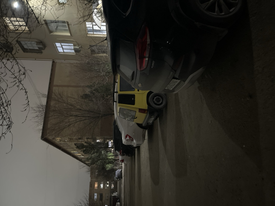 This image depicts a nighttime scene in Navoiy City, Uzbekistan. The foreground shows an unpaved parking area where multiple vehicles are sequentially parked. Closest to the viewer on the right is the rear of a dark-colored Chevrolet Trax SUV, displaying a "TURBO" badge and a partially visible license plate beginning with "01 H 003 YA". Immediately behind it is a yellow microcar, likely a Daewoo Matiz, fitted with a black roof rack. Further back in the line are a white sedan and a dark sedan. Vehicle shadows are cast distinctly across the dark, unpaved ground. To the right, a multi-story, light-colored apartment building stands, featuring several windows with interior lights visible and some exterior air conditioning units. In the background, additional multi-story residential buildings are visible, also exhibiting illuminated windows. Bare tree branches, characteristic of dormant vegetation, are prominent in the upper portion of the frame and interspersed throughout the scene. The sky is overcast and dimly lit by ambient city lights. No individuals are present in the depicted scene.