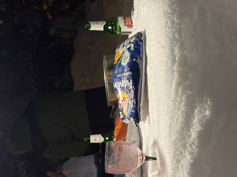 A messy scene in the snow features two empty green beer bottles, one Stella Artois. An open bag of potato chips, a silver metal container, and a pink wine glass are also present. A person wearing a dark jacket and light-colored pants stands near the scene. The background appears to be a snowy yard or landscape at night.
