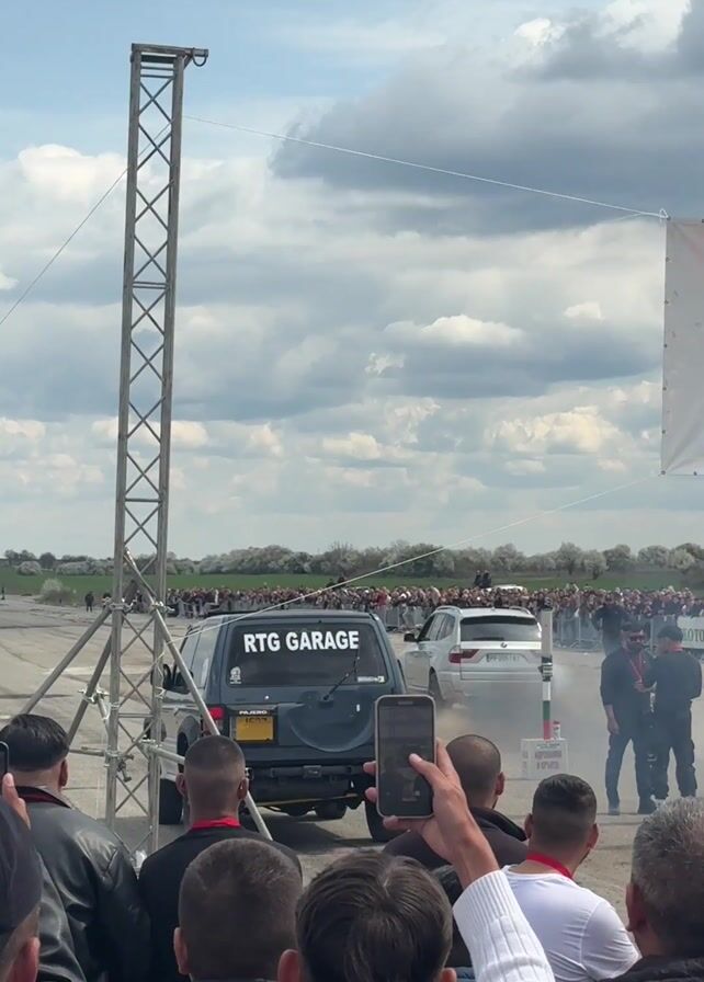 crowd of people filming with their phones two SUVs preparing for a drag race. A dark blue Mitsubishi Pajero with “RTG GARAGE” printed in white on its back window is in the left lane, and a white SUV is in the right lane. Both cars are smoking their tires. There is a metal tower on the left of the frame, and a banner on the right. The background shows a flat field under a partly cloudy sky.