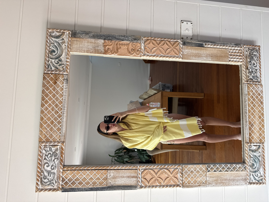 A mirror with a decorative wooden frame hangs against a white wall. The frame features alternating carved and patterned sections. The reflection shows a woman holding a phone, wearing sunglasses and a yellow and white striped garment. In the background, a wooden table, a potted plant, and a glimpse of a cluttered area are visible. The overall scene appears to be an interior setting.