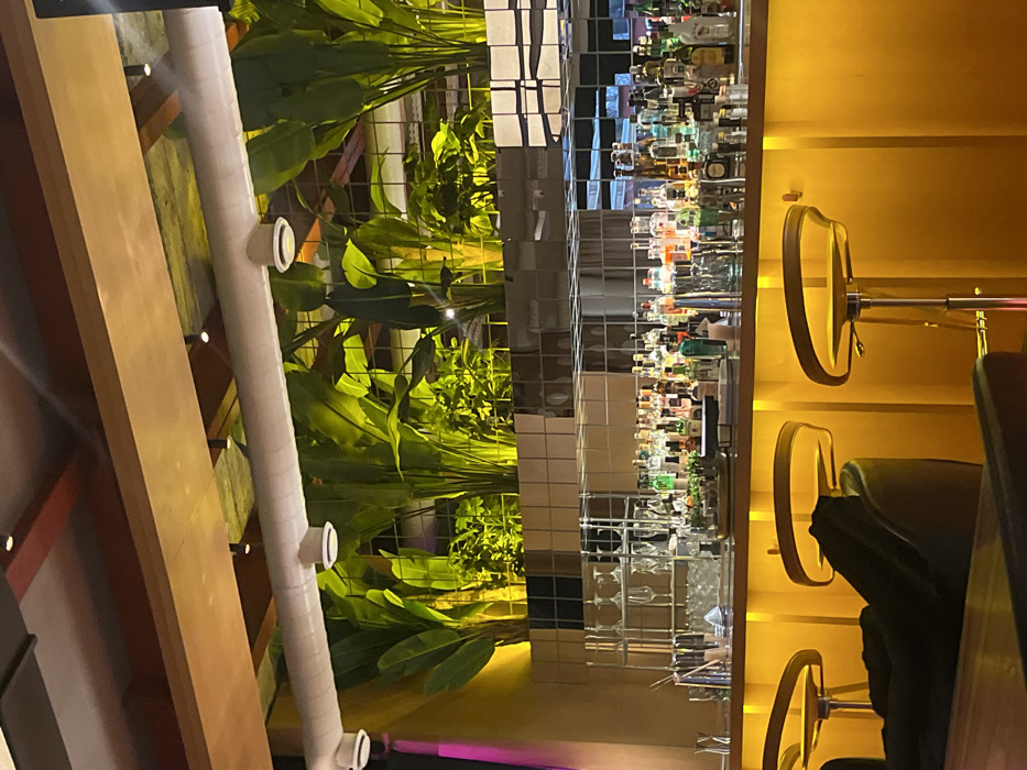 The image depicts the interior of a bar in Yerevan, Armenia. The scene focuses on a brightly lit bar counter and its immediate background, devoid of individuals. In the foreground, a dark table surface is visible at the bottom left. Three empty bar stools with dark, possibly leather, seats and polished metallic bases are positioned in front of a bar counter. A dark garment is draped over the leftmost stool. The main bar counter features a light-colored top surface and is illuminated from beneath by a continuous strip of intense yellow-orange light, which highlights the vertical panels below the counter. On the counter, various bar tools are present, including multiple silver-colored cocktail shakers, an ice bucket containing ice, and assorted drinking glasses. Behind the counter, numerous glass bottles of various alcoholic spirits are arranged on tiered shelving, displaying a wide selection. To the left, a metal rack holds a collection of clean, empty stemmed glasses. The wall directly behind the liquor display is covered with small, square, reflective tiles arranged in a grid pattern. Above the tiled wall, a series of large, broad-leafed green plants are displayed in unseen planters, extending across the frame's width. These plants are strongly illuminated by overhead spotlights, creating a vibrant green appearance. A dark, possibly metal, grid structure is visible behind and amidst the foliage. The ceiling structure includes exposed wooden beams, a horizontal white cylindrical ventilation pipe with integrated downlights, and additional small, black track-mounted spotlights. A vertical strip of pink-purple light is visible on the far left wall.