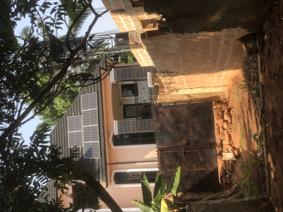 The image depicts an outdoor residential scene in Ifitedunu, Nigeria, under clear skies with bright sunlight. The central feature is a two-story house with salmon-pink painted exterior walls and a dark grey tiled gable roof. Five rectangular solar panels are mounted on the upper section of the roof, arranged in two rows: two panels above three panels. The visible facade includes two tall, dark-framed arched windows on the ground floor. Above the ground floor, a raised veranda or balcony features a dark grey textured tile facade, a dark-framed door, a wall-mounted light fixture, and an ornate black metal railing with scrollwork. In the immediate foreground, a large, double-leaf, dark-brown metal gate, appearing aged or rusty, is closed and secured by visible latches or padlocks. The base of the gate is partially obstructed by a small pile of reddish-brown bricks and loose earth. To the right of the gate, a partially constructed wall made of reddish-brown concrete blocks extends horizontally, with some sections displaying unfinished blockwork and others showing rough concrete rendering. A tall metal structure, likely a water tower, supporting a black cylindrical water tank, is visible behind this wall and house, with a smaller black tank at its base. The ground in the foreground is unpaved, consisting of reddish-brown soil with sparse green vegetation, including small plants and a banana plant with broad green leaves on the left. The scene is framed by dark tree branches and green foliage from trees overhead and in the background. Strong sunlight casts distinct shadows across the ground and walls. No people or animals are present.
