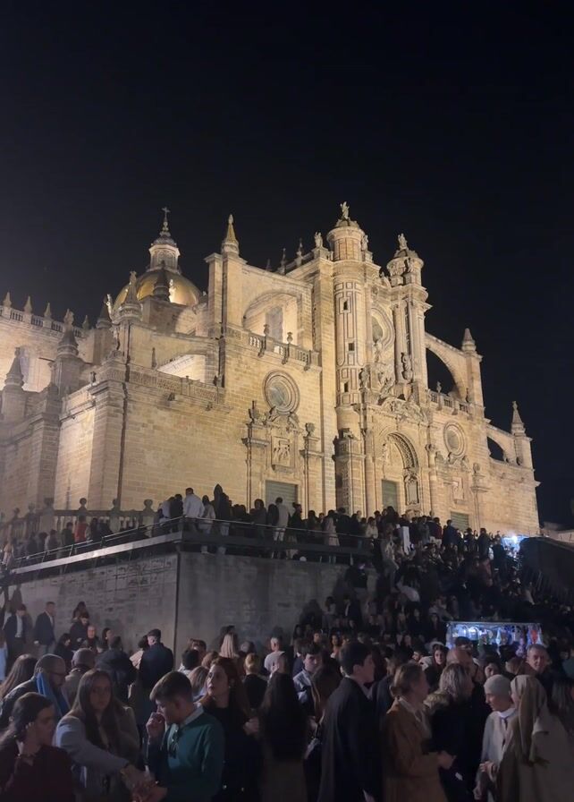 This nighttime video shows a large crowd gathered in front of a brightly lit, ornate cathedral
