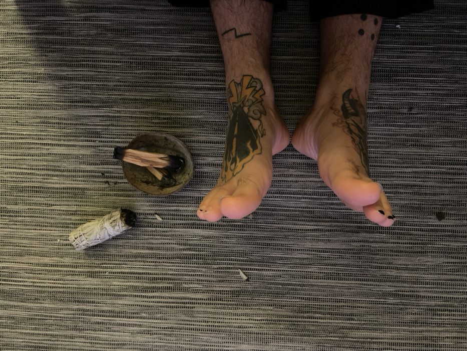 Two feet with tattoos are placed on a woven mat. The left foot has a design resembling a volcano with lightning, while the right foot features a different tattoo. Some toenails are painted black. Next to the feet, a small bowl containing smoldering palo santo wood and a bundle of white sage are present. The setting suggests a ritualistic or spiritual practice.
