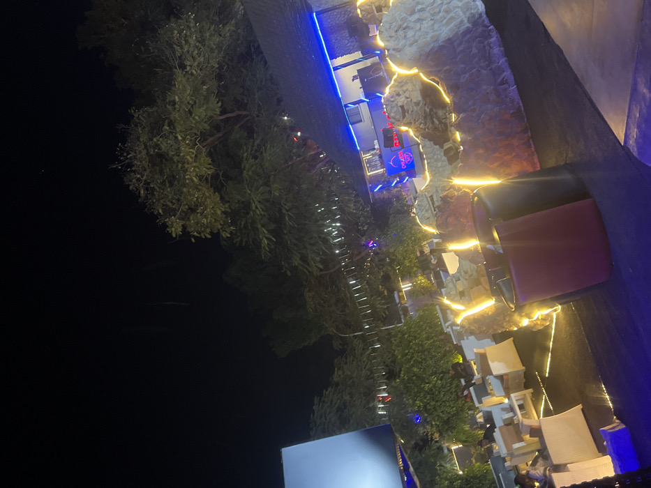 Nighttime scene of an outdoor restaurant. Tables and chairs are set up, illuminated by strings of warm lights. A building with bright blue neon outlines is visible in the background. There are trees on the side. A dark chair is visible on the side.
