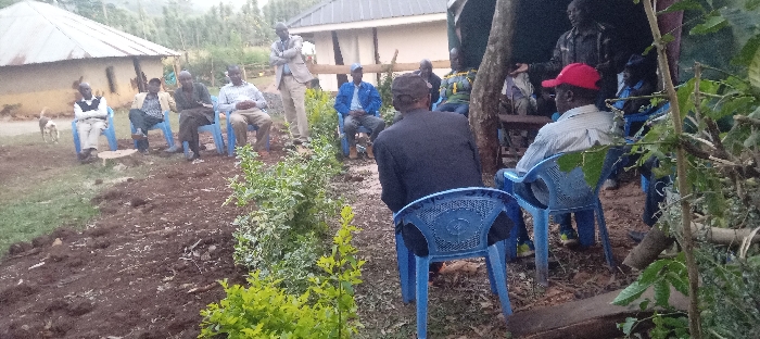 A group of men are gathered outdoors, some seated in blue plastic chairs, others standing. They appear to be in a rural setting, with simple buildings visible in the background. One man is wearing a suit and standing, possibly addressing the group. A row of plants or bushes separates part of the group from an area of cleared or tilled earth. One individual is wearing a red baseball cap.