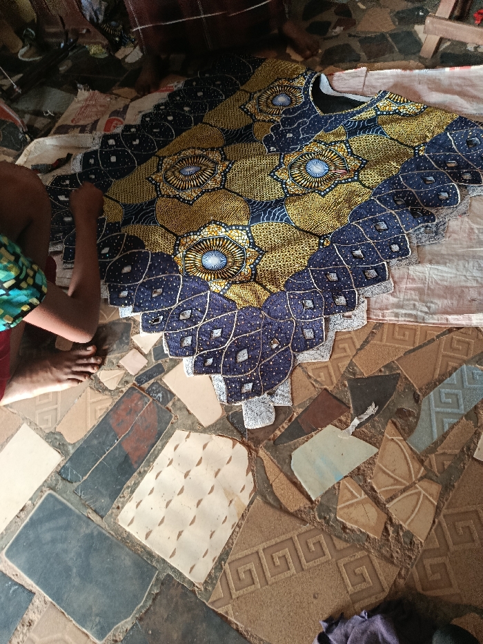 The scene, located in Ube, Nigeria, depicts an indoor setting from an overhead perspective. The primary subject is a large, colorful fabric garment, possibly a kaftan or dress, laid flat on a light-colored ground sheet. The garment features a pattern of alternating hexagonal sections: some are golden with speckled texture and a central blue and white circular motif, others are dark blue with an ornate geometric design. The garment's edge is multi-layered and scalloped, predominantly dark blue with light speckles and golden outlines forming diamond shapes. A dark, plain neckline is visible at the top of the garment. Two individuals are partially visible. In the upper left, the lower legs and bare feet of one person are seen, wearing patterned shorts. Their left arm and hand are positioned near the garment's left side, appearing to be engaged with the fabric. In the top center-right, another bare foot is partially visible. The floor beneath the ground sheet is composed of an irregular mosaic of broken ceramic tiles. These tiles vary in color (brown, beige, grey, black, light blue) and include sections with geometric patterns such as Greek key designs and small repeated diamonds. The grout or filler between the tiles is a sandy, earthy color. In the lower right corner, a crumpled piece of dark blue or purple fabric rests on the tiled floor. The upper background shows indistinct dark elements, possibly part of a wooden furniture item.