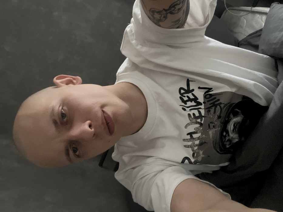 The image depicts an indoor scene in Novoshakhtinsk, Russia, featuring a single individual, identified as male, posing for a self-portrait. The subject has a completely shaved head and a light complexion. Their facial expression is neutral, with direct eye contact towards the camera. A faint red mark is visible below the subject's left eye. The subject is wearing a white, short-sleeved crew-neck t-shirt with a prominent graphic design on the chest. This design includes the text "ROTTWEILER FASHION" in a distressed, dark font, superimposed above a grayscale image of a Rottweiler's head wearing a hat or bandana. A dark-colored, intricate tattoo is visible on the subject's left upper arm, extending onto the shoulder, featuring swirling or wave-like patterns. The background consists of a dark gray, textured surface, possibly a wall or a headboard. In the lower foreground and extending to the sides, dark gray fabric, likely bedding such as pillows and blankets, is visible. A dark, angular object, potentially part of furniture, is partially visible behind the subject's left shoulder. The lighting is frontal and somewhat subdued.