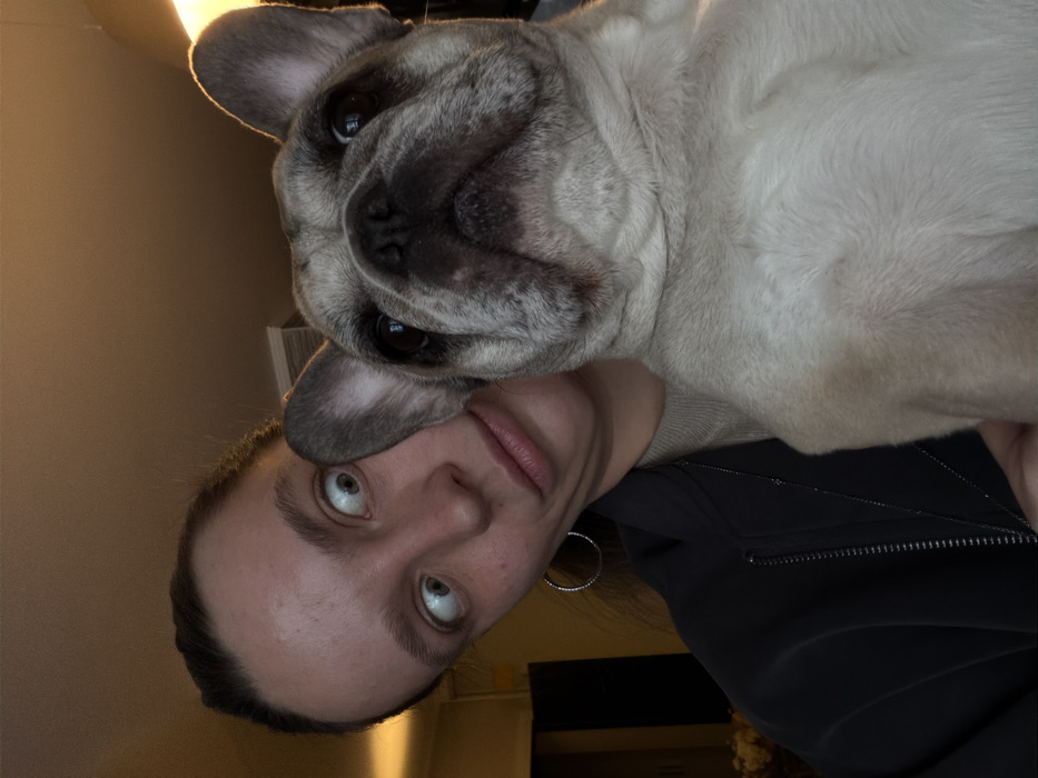 A person is positioned at the bottom of the frame, face tilted upwards. Large, wide eyes gaze towards the camera. Above the person is a French bulldog, its face close to the camera. The dog's large, wrinkled face and dark eyes are prominent. The background appears to be a room interior with a muted color scheme. The lighting is soft and warm. The person is wearing a dark jacket and a necklace.