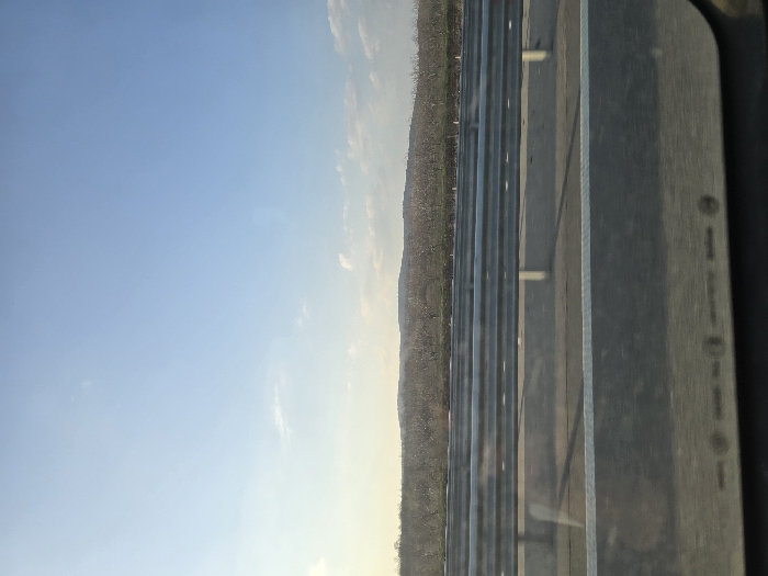 The image presents an outdoor landscape, observed from within a vehicle, likely in the vicinity of Malko Tranovo, Bulgaria. The foreground shows the lower edge of a vehicle's side window or interior panel, displaying faint reflective markings. Immediately beyond this, a multi-lane roadway is depicted with two parallel, horizontal metal crash barriers (guardrails) extending across the mid-ground. A dark asphalt road surface is visible between and behind the guardrails. The background features a large expanse of bare deciduous trees, possibly an orchard or natural forest, extending towards a distant, low-lying hill range. The upper portion of the frame is dominated by a pale blue sky with sparse, wispy white clouds. A subtle yellowish tint on the left side of the sky indicates the low position of the sun, suggesting either early morning or late afternoon. No people, animals, or other vehicles are discernible within the visible scene.
