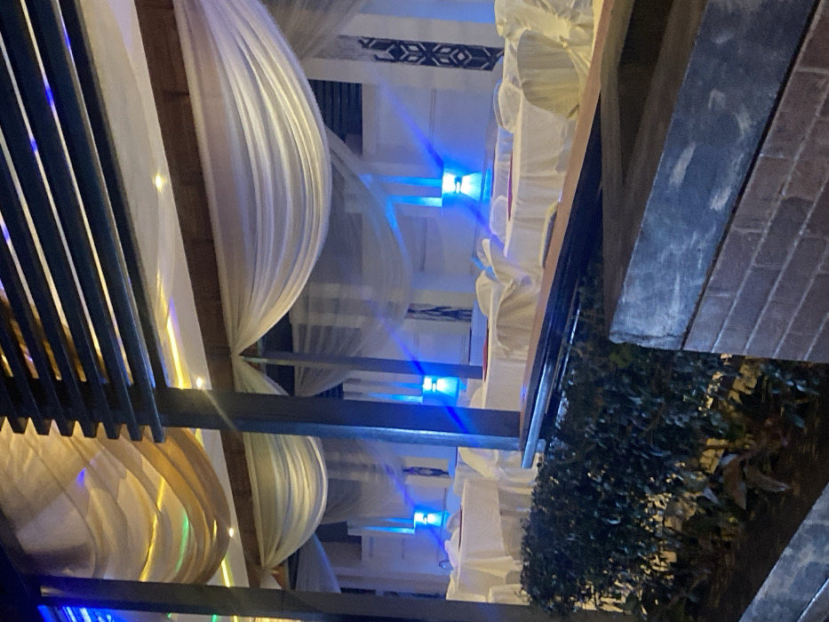 An outdoor event space features draped white and gold fabrics overhead, illuminated by blue lights. The fabrics are suspended from a dark wooden structure, with dark vertical slats visible on the left. Tables with white tablecloths and ruffled edges are set up. Lush green foliage partially obscures the view on the right, with a rough, brick-like surface beyond the foliage. The overall ambiance is festive and elegant.