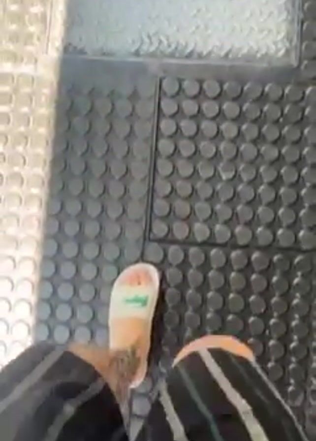 A person wearing striped shorts and white Lacoste slides is walking outdoors. The camera, positioned as a first-person perspective from the walker, shows the feet and shorts as they traverse a variety of surfaces including black circular tile, metal diamond plate with red graffiti, and square tile. A metallic clang can be heard. The lighting conditions are sunny with dappled shadows on the ground.