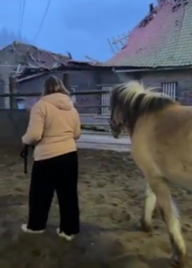 A woman wearing a light pink jacket and black pants leads a light brown horse through a sandy area. The horse has a pale mane and tail. The woman holds a black lead rope. Behind them, a building is damaged, with parts of the roof collapsed and debris visible. The sky is overcast, indicating either early morning or late evening.