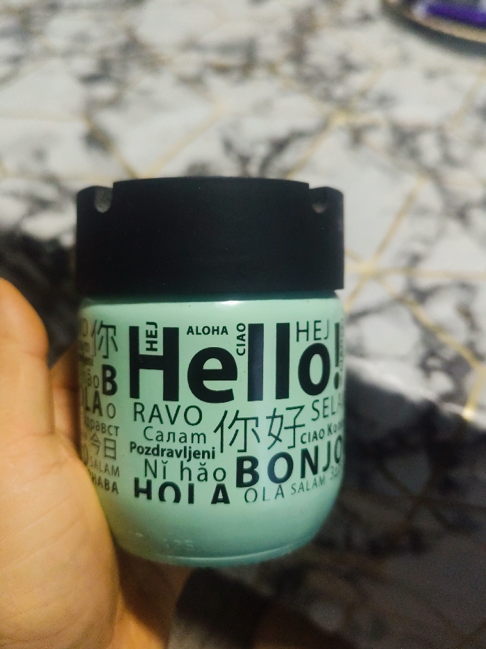 A round container, light green with a black lid, displays the word "Hello" in large black letters, surrounded by "Hello" in various languages. These include Chinese, Lao, Serbian, Slovenian, Swahili and others. The background is a blurry surface resembling marble or a similar textured material. A hand is visible on the left side of the container.
