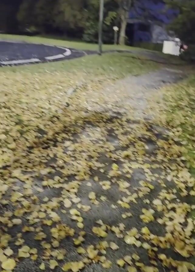 The video depicts an outdoor scene at twilight, likely an autumn evening