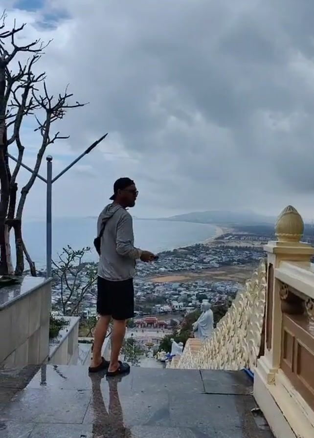 A man is standing on the steps of a high vantage point, possibly a temple or shrine, overlooking a coastal city. The man is wearing a light gray hooded jacket, black shorts, and a black baseball cap. He has a black bag slung across his shoulder and is wearing sunglasses. The sky is overcast, and the view extends to a beach and the ocean. In the distance, there are wind turbines along the coast. The stairs are marble, and there is a decorative railing beside them. The man looks around and appears to be admiring the view, holding a small electronic device in his hand. A bare tree stands next to the staircase.