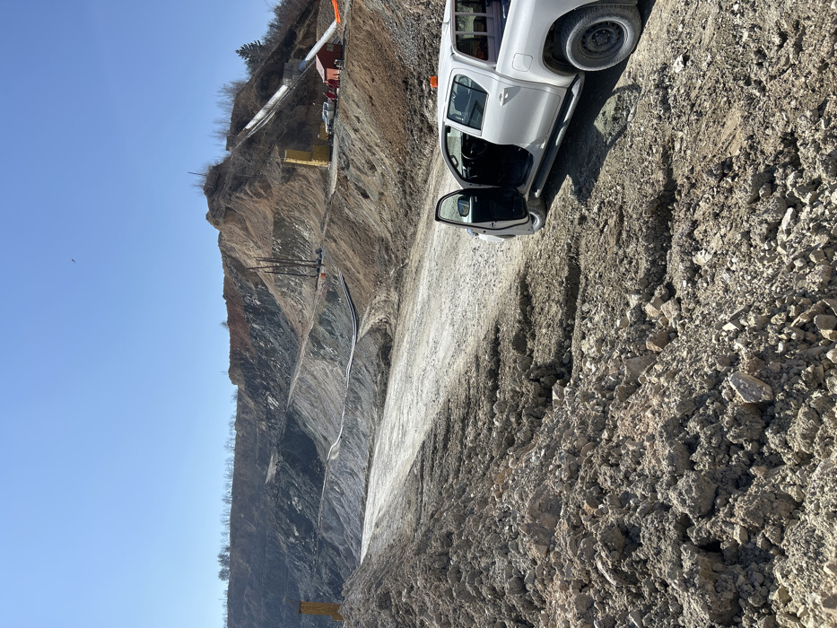 This image depicts an active open-pit mine or quarry operation in Panagyurishte, Bulgaria, under a clear blue sky. The foreground is dominated by a wide, unpaved dirt road, light tan in color, which shows signs of heavy vehicle traffic and tire tracks. To the left of the road, and in the immediate foreground, are piles of loose, dark brown and gray soil and rocks. On the right side of the dirt road, a white, four-door pickup truck, consistent with a Toyota Hilux model, is parked with its front driver's side door open. An orange warning light is affixed to its roof. The midground and background reveal extensive terraced excavations into the hillside, displaying varying shades of gray, brown, and reddish-brown earth and rock. Several black pipelines run horizontally along the slopes in the midground. Two distinct yellow, vertical structures, possibly mobile drilling rigs or temporary shelters, are visible: one on the far left midground and another positioned higher up on the right midground slope. Near the second yellow structure, two large, light-colored chutes or conveyor segments descend the hillside. Adjacent to these chutes, a small red-roofed building is situated, with a white vehicle and approximately three individuals wearing red attire visible nearby. Further up the slope, several tall, dark, vertical poles, possibly drilling equipment, are discernible. The top ridges of the excavated area feature sparse trees against the skyline. A small, dark, indistinct object is present in the upper right portion of the sky.