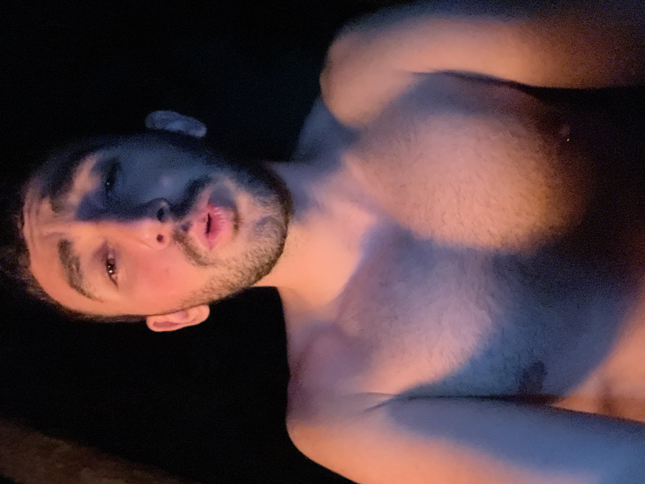 An adult male is depicted in a close-up portrait, framed from the chest upward, against an unidentifiable dark background. The individual has short, dark hair and a beard. His torso is bare. His mouth is slightly open, with lips pursed. He is looking directly at the camera. Illumination is provided by two distinct light sources: an orange-red light emanating from the viewer's right, casting light on the left side of his face and body, and a blueish-purple light emanating from the viewer's left, illuminating the right side of his face and body. The scene is situated in Modi'in-Maccabim-Re'ut, Israel.