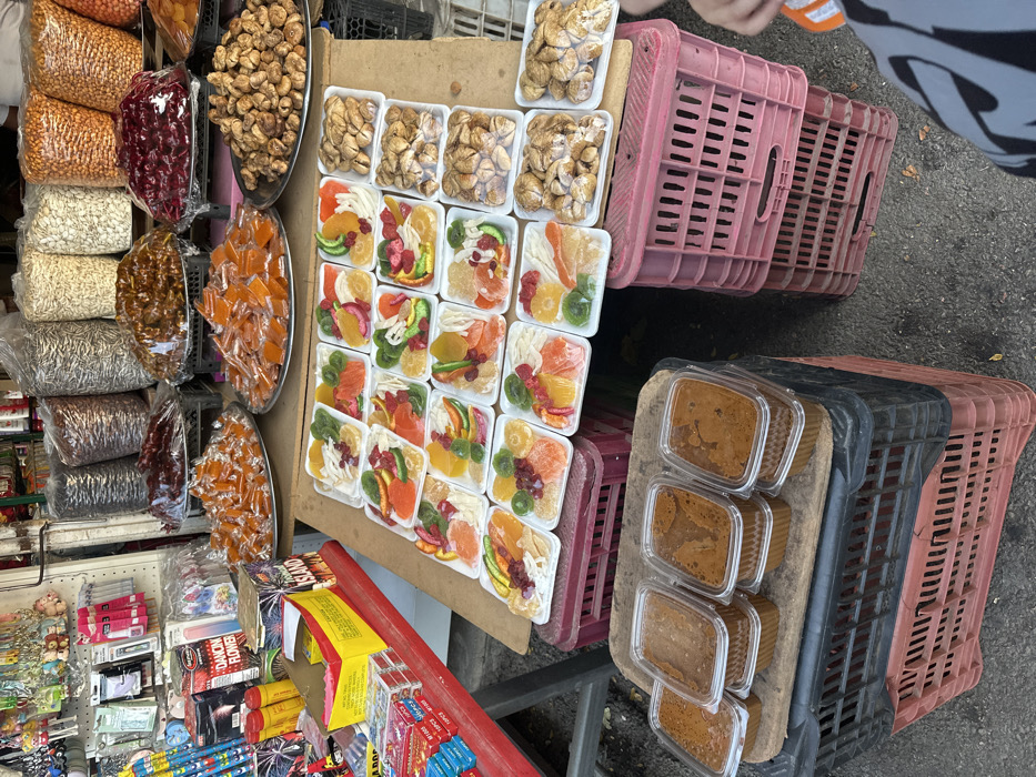 The image captures an outdoor market stall in Unknown, Unknown, displaying a variety of food items and merchandise