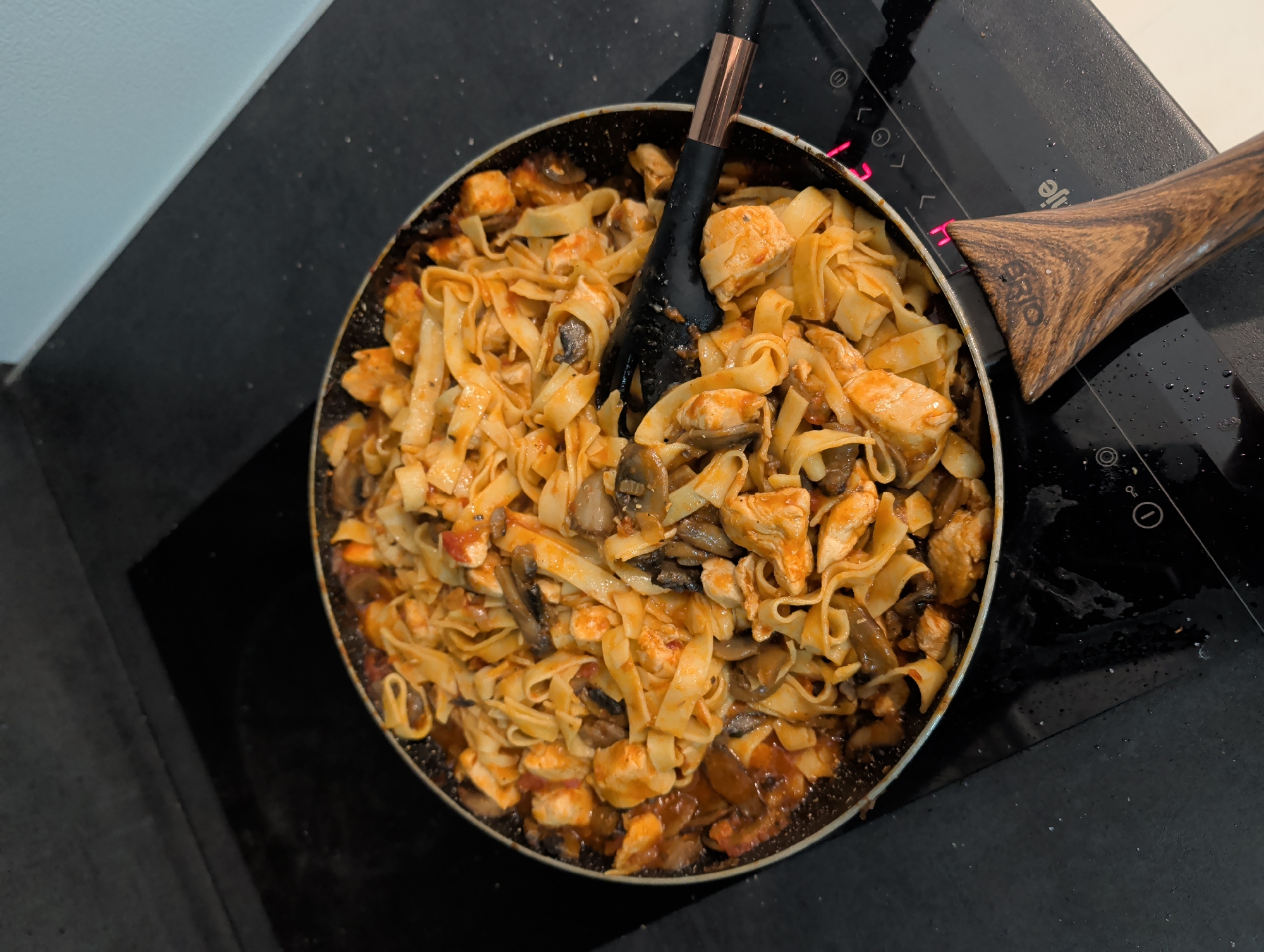 - "A top-down, medium shot depicts a black frying pan filled with cooked tagliatelle pasta, chicken pieces, and mushrooms, likely in a sauce" by FM-e4pO12, licensed under CC BY 4.0