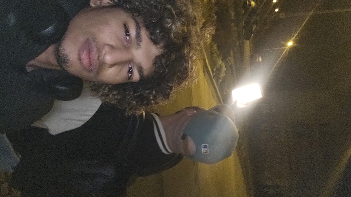 A person with curly hair wears a black jacket and gray baseball cap, holding a bright cell phone. The individual's face is visible, showing dark eyes and light brown skin. The background is dark, seemingly an outdoor street scene at night with dim streetlights. The person is positioned to the left, with the background occupying the majority of the frame.