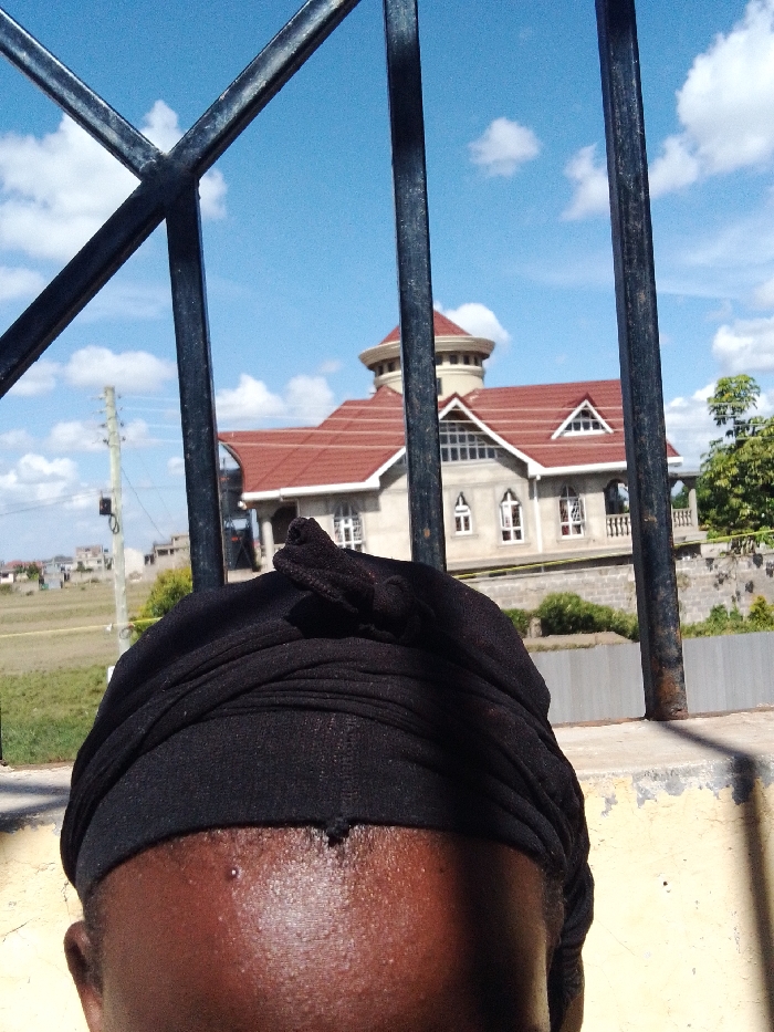 The image depicts an outdoor scene in Kalimoni ward, Kenya, viewed from behind a black metal barred structure and a yellowish concrete ledge. In the immediate foreground, the top of a dark-skinned individual's head, partially covered by a black headwrap, is visible. The forehead shows a slight sheen. Through the metal bars, a large, multi-story building with a prominent red tiled roof is centered in the midground. This building features multiple gables, white-framed windows, and a distinctive light-colored cylindrical turret structure on its upper left side. Below the building, a grey retaining wall is present. To the left of the building, an open grassy field with scattered smaller structures and a utility pole is visible. Lush green trees are seen on the right side of the building and in the distant background. The sky is bright blue with scattered white cumulus clouds, indicating a clear, sunny day. No explicit actions or interactions are visible.