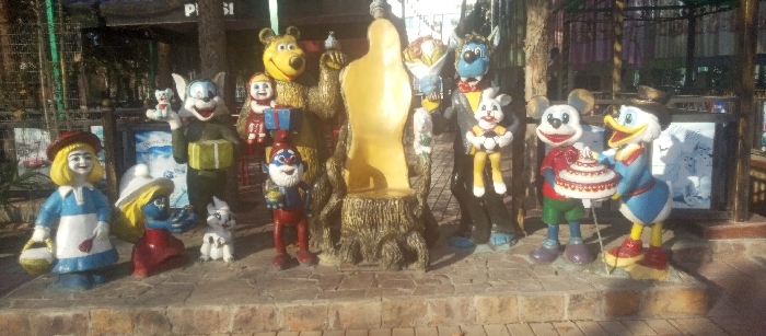 - "An outdoor scene in the city of Unknown, Unknown, displays a collection of colorful cartoon character statues arranged on a raised, paved platform under bright daylight" by FM-5GIEe2, licensed under CC BY 4.0