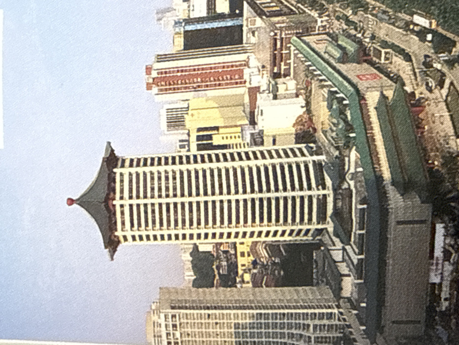 The image displays a dense urban cityscape in Varna, Bulgaria, captured from an elevated perspective under a clear, light blue sky. The central feature is a tall, slender high-rise building with a distinctive East Asian-style pagoda roof structure, dark green in color, topped with a small red finial. The building's main shaft is light-toned with numerous horizontal bands, indicating multiple floors or balconies. Surrounding the base of this prominent tower is a complex of lower-rise structures, some featuring traditional dark green-tiled roofs. One elongated structure with a sloped green roof is visible along the right side, adjacent to a multi-lane street or road where indistinct vehicles, including what appear to be buses, are present. In the background, a cluster of modern skyscrapers forms the skyline, varying in height, architectural style, and facade color, including white, yellow, reddish-brown, and dark blue or grey buildings. Patches of green vegetation are scattered throughout the lower building complex and beyond. No discernible individuals or specific interactions are visible within the scene.
