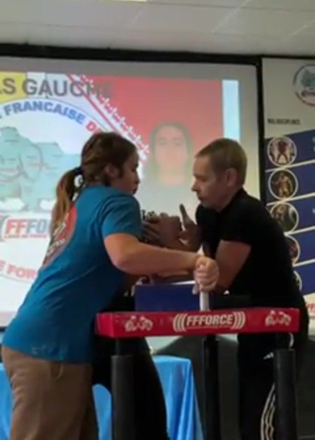 In an indoor setting, two individuals are engaged in an arm wrestling match. A man in a black shirt and black pants with white stripes is facing a woman in a blue shirt and brown pants. They are both gripping hands on an arm wrestling table marked with "FFFORCE". A referee stands to the side, observing the match. Behind them, a projector displays a poster with text in French, including the words "LAS GAUCHE" and "FEDERATION FRANCAISE DE FORCE." The room appears to be a conference or training space, with fluorescent lighting and additional posters visible on the wall. The participants are focused on the competition, displaying tense facial expressions.