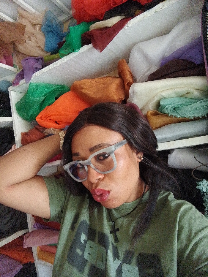 A woman with dark hair and glasses poses with pursed lips. She wears a green t-shirt with the word "BOYS" printed on it and a cross necklace. A gold watch adorns her left wrist. Behind her, a cluttered white shelf overflows with fabrics of various colors, including orange, green, red, and white. The lighting is bright, and the photo seems to be taken from a low angle.