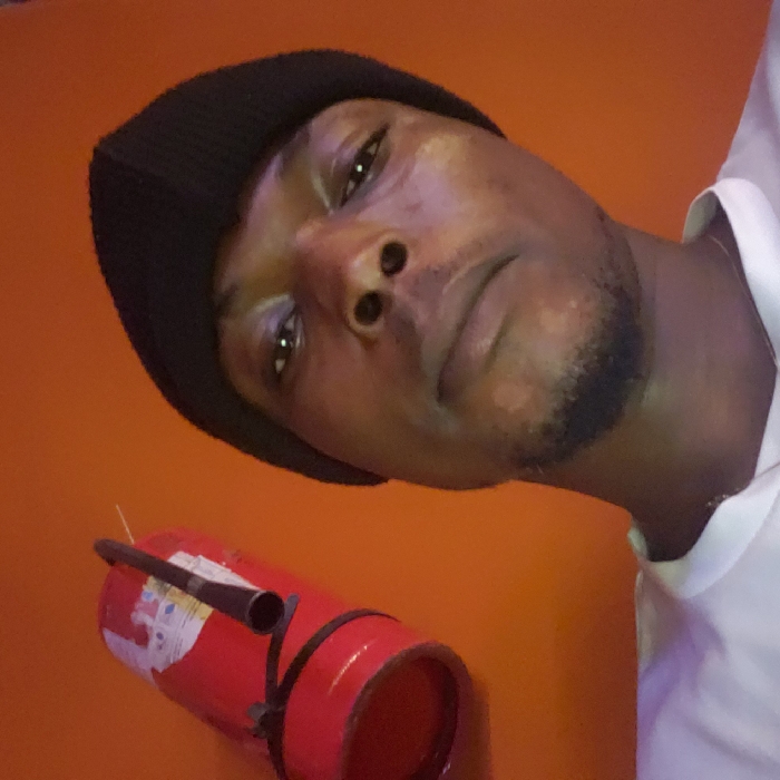 The image features an adult male positioned centrally and to the right, captured in a close-up from a low angle. He has a dark complexion, a short beard, and wears a black knit beanie and a white short-sleeved t-shirt. His eyes are directed towards the camera. To the upper left, a red fire extinguisher is mounted vertically on an orange-red wall, secured by black straps. A black hose and nozzle assembly are attached to the extinguisher; labels on its body are present but illegible. The background consists entirely of the plain, solid orange-red wall. The specific location within Asaba, Nigeria, cannot be determined from the visual information present in the image.