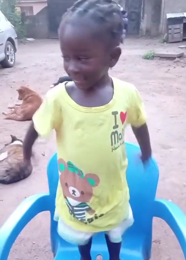 A young Black girl stands on a blue plastic chair outdoors. She is wearing a yellow t-shirt with a graphic of a bear and the text "I ❤️ Mama" and has her hair braided with colorful beads at the ends. She smiles and dances. In the background, two dogs are lying on the ground, and a car, buildings, and greenery are visible. The ground appears to be sandy or dirt.