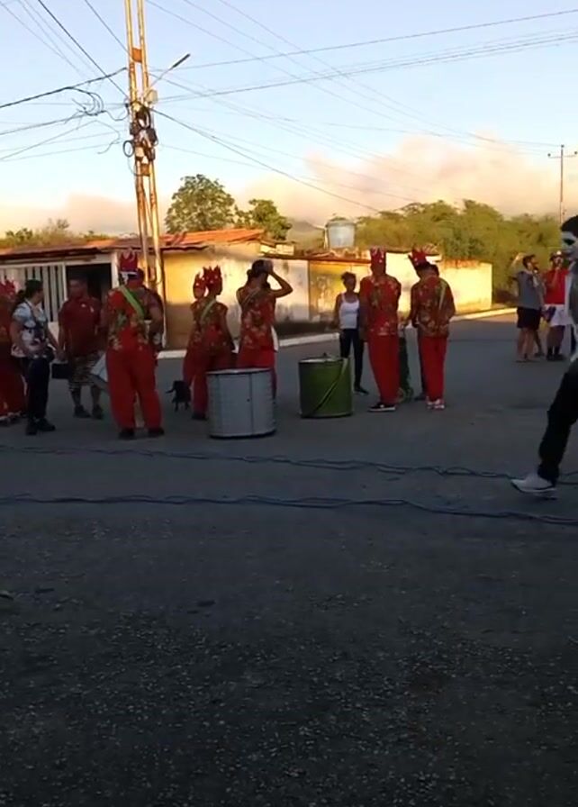 group of people, some dressed in red costumes and hats, standing in a street. There are two metal barrels in the middle of the group. Some people are setting up a rope on the ground. A few people are walking around the group. The background shows houses and trees under a slightly cloudy sky. A power pole is visible near the front of the scene.