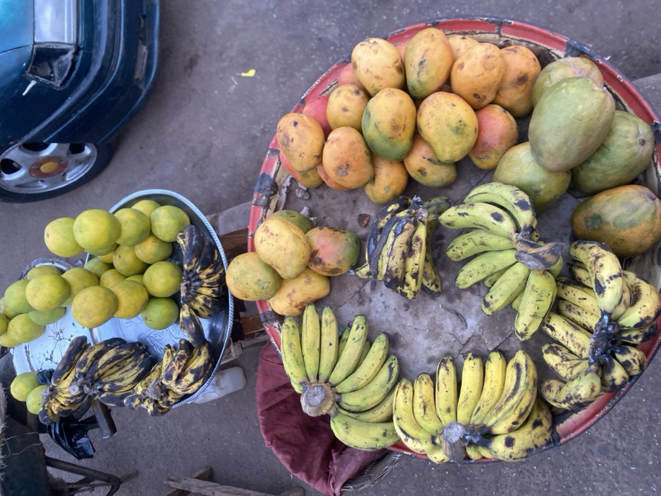 A high-angle shot reveals two trays of fruit beside a car. A red-rimmed tray holds a large pile of mangoes, arranged beside bunches of green and yellow bananas, some with black spots. A smaller, silver tray displays a stack of green citrus fruits next to a bunch of overly ripe bananas. The fruits appear to be for sale, likely at a roadside market.