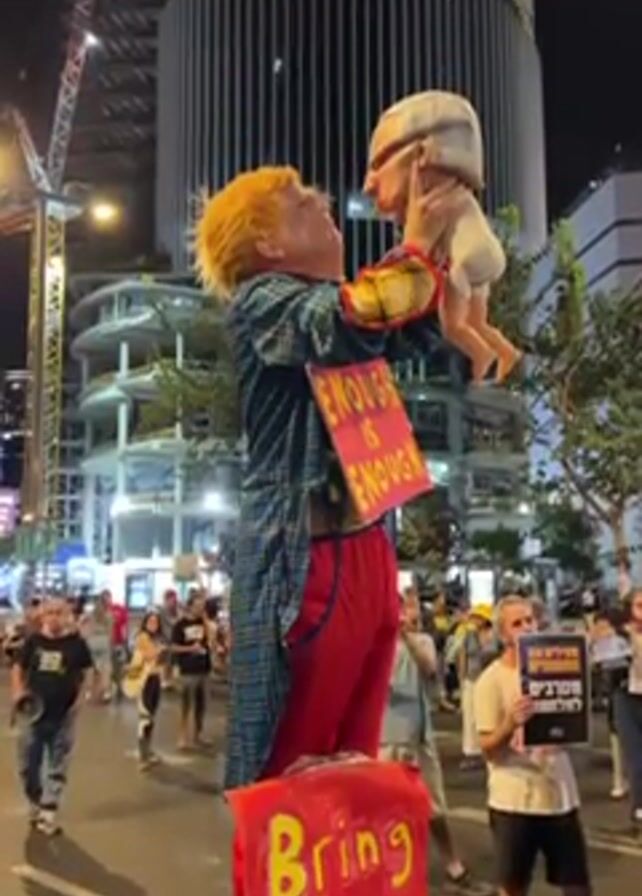 A person in costume stands on stilts in a crowd of people, holding a baby doll. The costume includes red pants, a plaid shirt, and an orange wig. The person is also wearing a sign that says "ENOUGH IS ENOUGH." A sign below reads "Bring them No Selection." The crowd of people is standing in a city street at night. Some people are holding signs. A tall building is in the background.