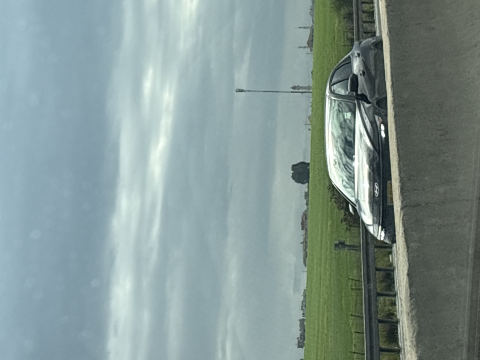 The image depicts an overcast daytime scene from a vehicle's perspective, looking forward and slightly right over a concrete median barrier. In the immediate foreground, a grey concrete barrier partially obscures the lower section of a dark-colored Hyundai sedan (likely a 7th generation Elantra) traveling on a multi-lane road. The car's windshield reflects the grey sky. Behind the Hyundai, a metal guardrail separates the road from a wide, vibrant green field stretching horizontally across the midground. On the distant horizon line, within the green field, various structures are visible against the skyline. To the far left, a cluster of low-rise buildings or structures is present. In the center-right, a tall, slender utility pole or telecommunications tower stands prominently. To the right of this tower, the distinct silhouette of a mosque minaret is discernible, flanked by other distant buildings. A dense, dark green cluster of trees is also located in the field. The upper two-thirds of the image comprise a heavily overcast sky, filled with multiple layers of grey clouds. The location is in Unknown, Israel. No people are explicitly visible.