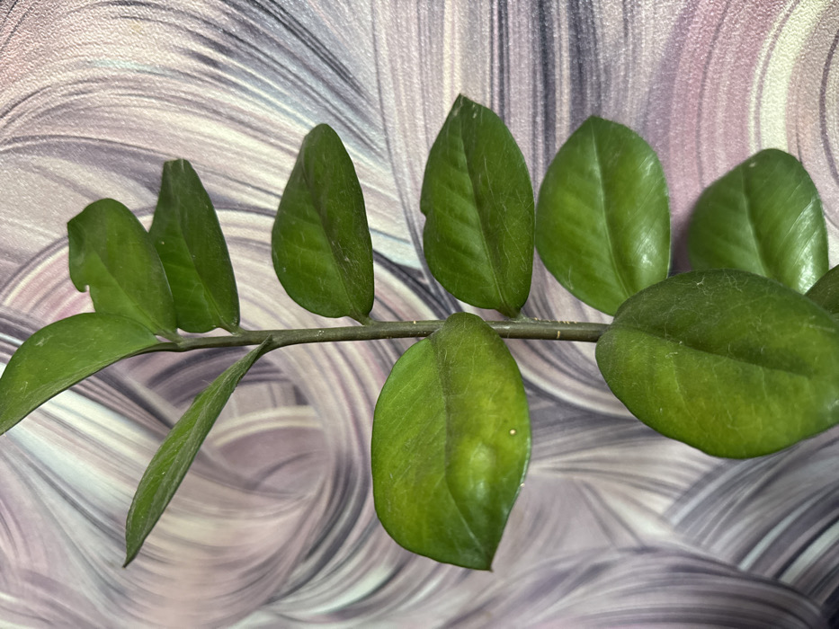 - "The image displays a vertical close-up of a Zamioculcas zamiifolia (ZZ plant) stem and its foliage, situated indoors, implicitly within Saratov, Russia" by FM-UpI5v1, licensed under CC BY 4.0