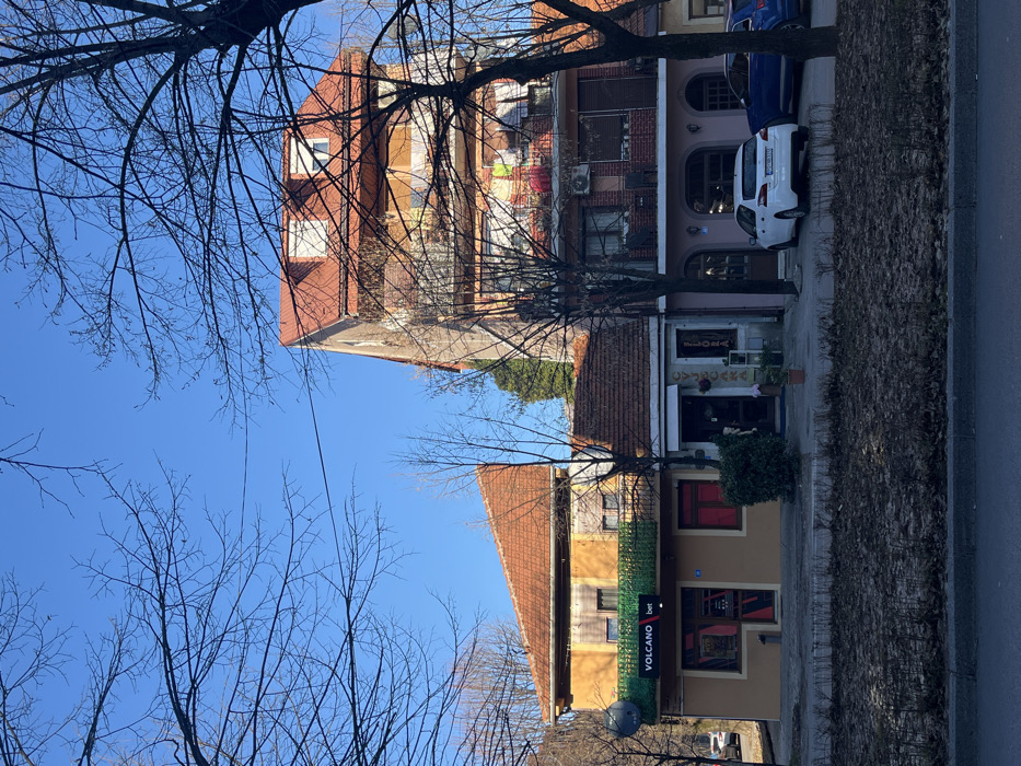 This image depicts a street scene in Cetinje, Montenegro, under a clear blue sky. The foreground features a paved street and a median strip covered with dark, low-lying vegetation or mulch. Bare-branched deciduous trees frame the top and sides of the view, indicating a dormant season. Three primary buildings are visible: 1. On the left, a two-story structure with a reddish-brown tiled, steeply pitched roof. The upper story facade is yellow-orange, featuring a green artificial grass-covered balcony railing and a black satellite dish mounted on the upper left. The ground floor, with a darker brown facade, displays a "VOLCANO bet" sign in white and red, indicating a betting establishment. A red window or door is to its right. 2. In the center-left, a smaller, single-story building with a brown tiled, gently sloped roof. Its facade is light-colored, and a vertical sign reads "CVJECARA FLORA" (Flower Shop Flora). A dark green shrub and a potted plant are positioned near its entrance. 3. On the right, a taller, multi-story building with a red tiled, steeply pitched roof featuring two dormer windows with white roller shutters. Its facade transitions from light beige on the upper floors to pinkish on the lower two. The building has multiple balconies; the second-highest visible balcony displays hanging laundry items (red, yellow, blue). An air conditioning unit is mounted on the first-floor balcony. The ground floor features arched openings. Two cars are parked on the street in front of the rightmost building: a white Peugeot hatchback (rear visible) and a dark blue SUV parked behind it. No individuals are visible in the scene, and no overt actions or interactions are depicted.